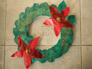 Yo le conseguí el molde de las hojas de la flor de Nochebuena. Sofia la recorto, agregó brillo a flores y corona y ya ! Directo a la puerta !