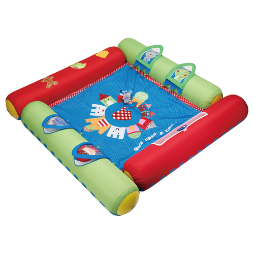 La base es mullida y está rodeada de grandes cilindros inflables. Además tiene bolsillos laterales y una práctica bolsa para guardarlo cómodamente.