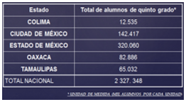 De los estados que están en la tabla. ¿Cuál tiene menor cantidad de alumnos en quinto grado? R = Colima.