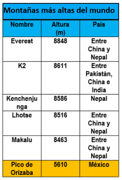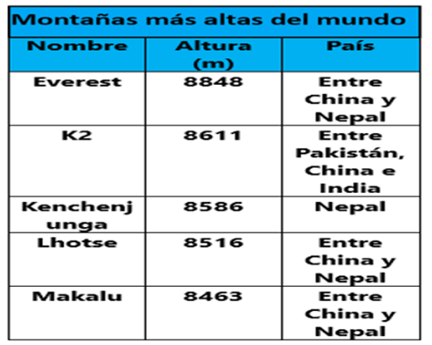 Observa la siguiente tabla con información acerca de las 5 montañas más altas del mundo.