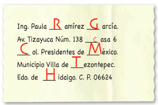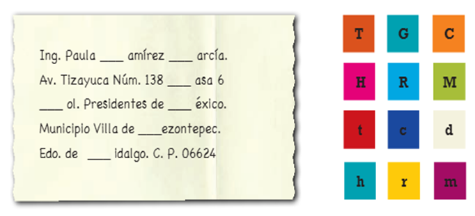 Como puedes ver, la imagen te muestra una pequeña ficha en la que se encuentra escrita la dirección de una persona, pero ésta tiene siete espacios vacíos, en esas condiciones parece casi imposible descifrar ese mensaje ¿cierto? A un costado, tenemos recuadros de colores con letras mayúsculas y minúsculas, seguramente estas letras completan el mensaje. Recuerda todo lo que has visto del uso de mayúsculas y minúsculas, así como las abreviaturas que en clases pasadas has trabajado, ya que te ayudará en esta importante misión.