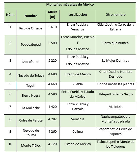 Hay otra tabla que precisamente tiene las montañas más altas de México.