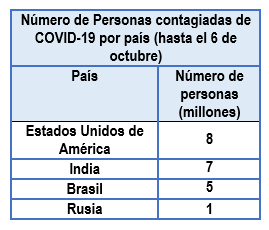 Observa muy bien la tabla donde aparecen los países que tienen un millón o más personas contagiadas.