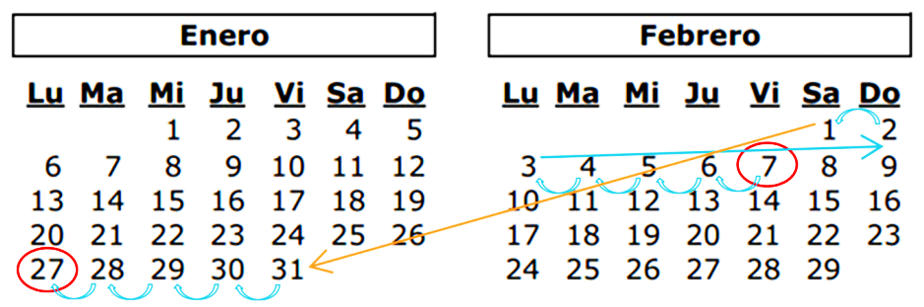 - Que si el evento ya sucedió, con relación a la fecha que se toma como referencia, entonces contarás regresivamente, es decir, hacia atrás, o bien puedes restar periodos como semanas, meses, años. Pero si el suceso se sitúa a futuro, se contará hacia adelante o se sumarán los días o periodos, según sea el caso.