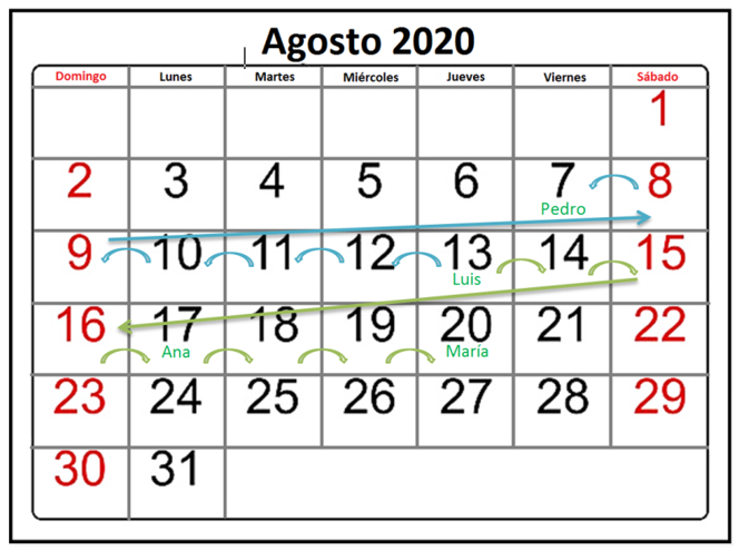 Analiza: Si tienes de referencia que Luis llegó el 13 de agosto y dice que Pedro llegó 6 días antes, entonces a 13 le restas 6 y da 7, que es la fecha que llegó Pedro. Por otro lado, se indica que María llegó una semana después que Luis, entonces a 13 le sumas 7 y da 20, que es la fecha en que llegó María. Y respecto a Ana no se realiza ninguna operación, porque se especifica el día que llegó.