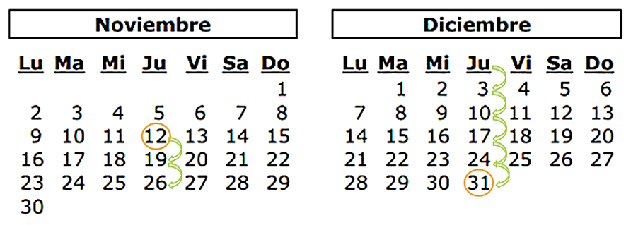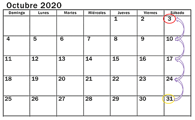 Entonces a ese número suma 7 días de una semana y da 19, le sumas otra semana más (otra vez 7) y da 26, le sumas la tercera semana (otros 7 días) y da 33, pero como este mes tiene 30 días, entonces ya cuentas los primeros días del siguiente mes que es diciembre y tomas los 3 primeros días para completar esta semana. Continúa… sumas la cuarta semana, (otros siete días) al 3 de diciembre y da 10, para la quinta semana, sumas 7 al 10 y da 17, una sexta semana, sumas otra vez 7 días y da 24 y, por último, sumas una séptima semana al 24 y da 31, que es el último día de este año.