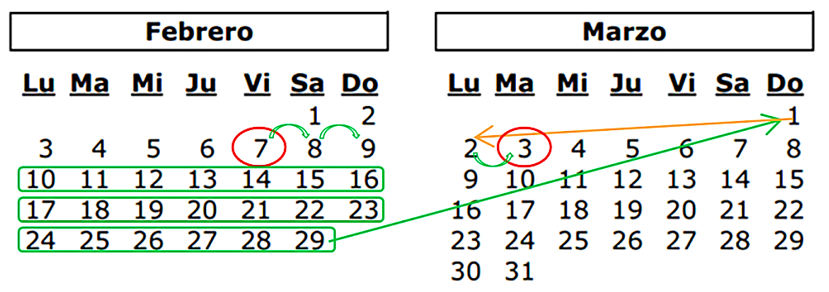 Sumarías los 25 días a los 7 días de febrero, es decir, 25 + 7, da 32. Pero en este año bisiesto febrero tiene 29 días, por lo que te falta contabilizar 3 días que los considerarás del mes siguiente, en este caso de marzo. Por lo que José cumplió años el martes 3 de marzo.
