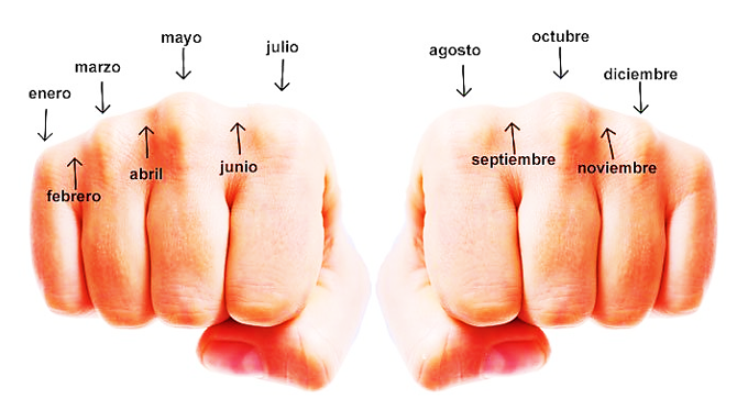 - A continuación, se mencionan los meses del año, nombrando como enero el primer nudillo, es decir, el nudillo del dedo meñique; el hueco intermedio entre éste y el segundo nudillo corresponde a febrero; el siguiente nudillo es marzo y el siguiente hundimiento es abril; así se continúa hasta llegar a julio, que será el nudillo del dedo índice.