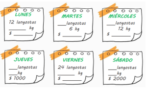 El viernes 24 langostas es el doble de 12, así que, si el lunes fueron 8 kilos, el doble para el viernes son 16 kg. Y si el lunes le dieron 4000 pesos, el viernes tenían que pagarle 8000 pesos.