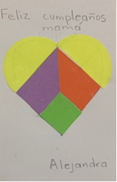 Una alumna de nombre Alejandra quiso compartir una tarjeta de cumpleaños que le obsequio a su mamá y que ella misma elaboró, formo un corazón, con varias figuras de colores, como las de tu tangram, que has utilizado en tus sesiones de Matemáticas de “Aprende en casa II”.