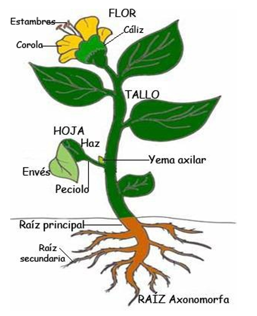 Raíz: fija la planta al suelo y absorbe agua y sales minerales.