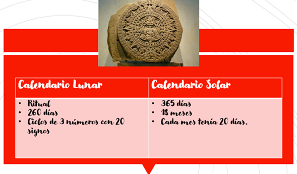 - Por lo regular, en el estudio de Mesoamérica se encuentras dos tipos de calendarios: El solar de 365 días y el lunar de 260 días, este último era un calendario ritual.