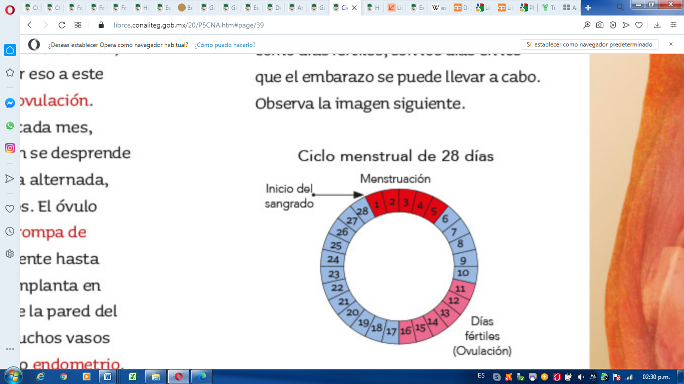 Toma un calendario y elige dos meses consecutivos. Marca un día, el que desees, éste será el día en el que aparecerá un ciclo menstrual imaginario, con ayuda de un adulto y tomando en cuenta el esquema marca un ciclo menstrual de 28 días. Con otro color identifica los días fértiles en este ciclo menstrual que simulaste, no importa que seas niño, tú también puedes hacer la actividad.