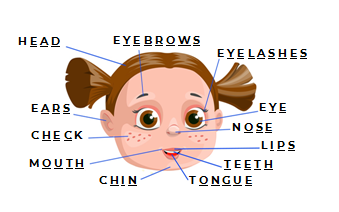 Por ejemplo: La primera parte de la cara empieza con la letra H y además tiene tres espacios y la flecha está apuntando en la cabeza ¿Qué letras le faltan? La E, la A y la D. HEAD muy bien. Repeat: HEAD.