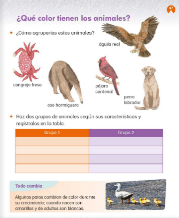 La indicación del libro es: “Haz dos grupos de animales según sus características y regístralos en la tabla”.