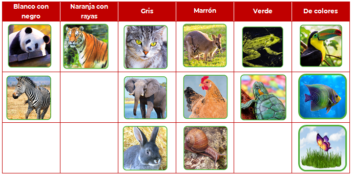 Otra forma de agruparlos es por tamaños, si tienen plumas o no, si vuelan. Existen muchas formas de clasificar a los animales. Por lo pronto puedes seguir practicando agrupándolos por colores. El próximo lunes seguirás conociendo más sobre los animales.