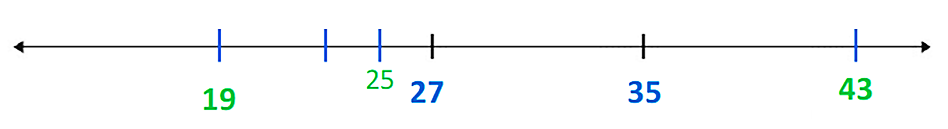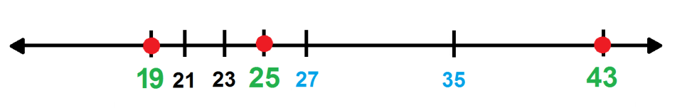 Claro, el 25 se encuentra entre el 19 y el 27, por lo que ese segmento lo puedes dividir en cuatro partes iguales. Anotas los números localizados en esas marcas y ubica al 25 y así es como quedan representados los tres números 19, 25 y 43, respectivamente
