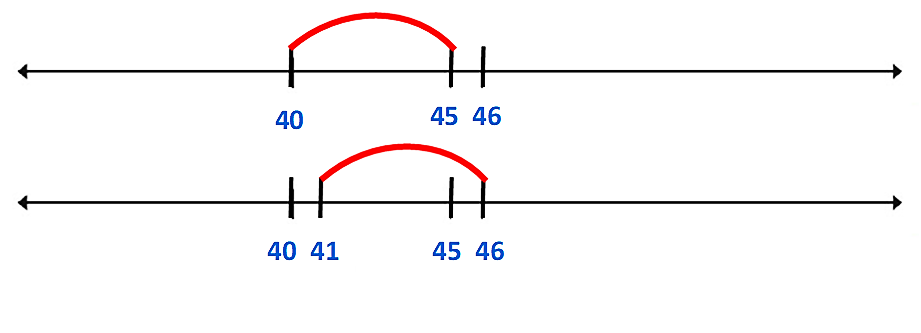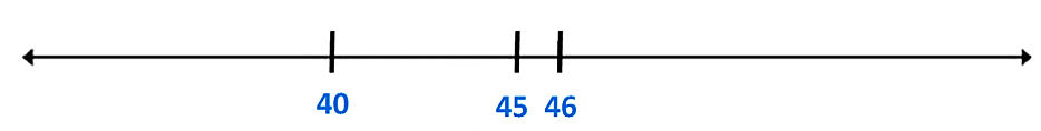 Tienes marcada la distancia entre dos unidades consecutivas, de manera que, si adelante del 40 ubicas el 41 y comparas las distancias que hay del 40 al 45 y del 41 al 46, estas distancias son iguales porque entre las dos parejas de números hay una diferencia de 5 unidades.