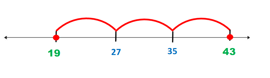 Si estableces cuántas unidades hay del 27 al 35 tienes 8 unidades: 28, 29, 30, 31, 32, 33, 34 y 35. Por ello cada marca en la recta indica grupos de 8 números. Para ubicar a los números 19 y 43 deberás restar y sumar respectivamente 8.