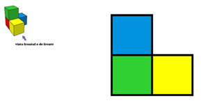 Además, observa que se pintó cada cuadrado del color según se puede apreciar en la formación: El color verde en la parte superior, en la base, del lado derecho se representa al cubo azul y de amarillo el que está a la izquierda.