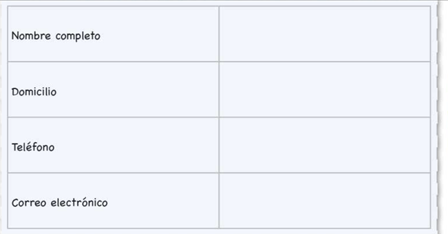 El primer apartado es “Nombre”, ¿cómo iniciarás, por nombres?, ¿cómo quedaría?, ¿y si ordenas por apellidos?, veamos… ¿de qué forma te agrada más? (ordenar por apellidos). Enseguida del nombre solicita que escribas la dirección, ¿puedes leer los datos que integran la dirección?, escribe tu dirección, ¿qué datos faltan por acomodar? El correo electrónico y el teléfono, ¿qué dato pide que escribas primero?, ¡el teléfono!, entonces, al final quedaría el correo electrónico, ¿hay algún dato que puedas agregar?