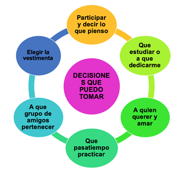 Por eso, es importante que, desde que somos pequeños o pequeñas, aprendamos a tomar decisiones, y que se nos oriente acerca de cómo hacerlo. Guiar a los niños y niñas para tomar decisiones consiste en que aprendan a analizar la situación y sus causas, a valorar las diferentes opciones disponibles, a reflexionar sobre las consecuencias, a escucharse y, en su momento, a decir que No. en todos los casos, con respeto a la dignidad, integridad y derechos propios, así como la dignidad, la integridad y los derechos de otras personas.