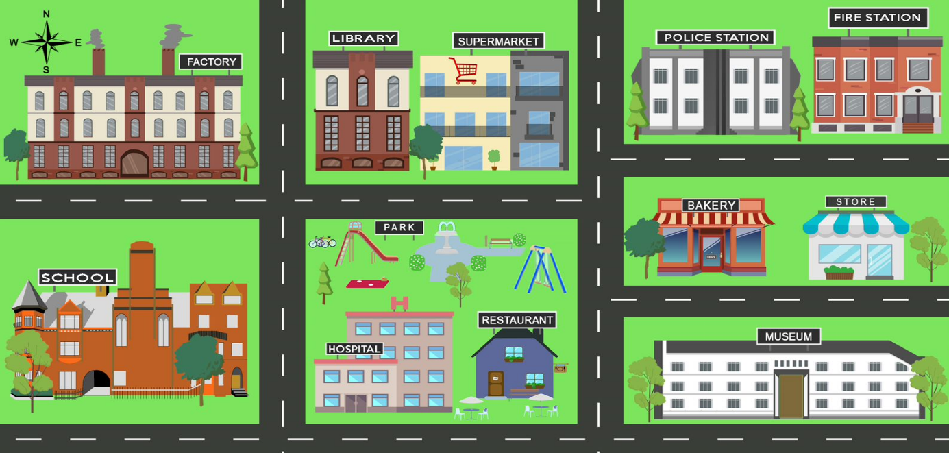 Explora un poco más. Elabora un dado. En cada cara del dado escribe un letrero con sitios. Vas a lanzar el dado dos veces, la primera para saber cuál es tu origen, y la segunda dirá el destino. Y cuando veas en nuestro mapa donde están estos sitios, puedes jugar con distintas maneras de llegar o de dar indicaciones.
