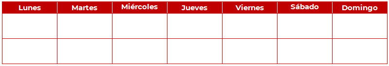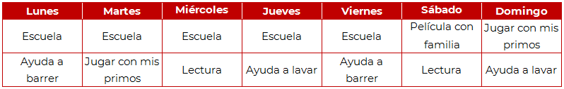 Te invito a que en tu cuaderno escribas los siete días de la semana y abajo de cada día las actividades que te toca o que quieres hacer.