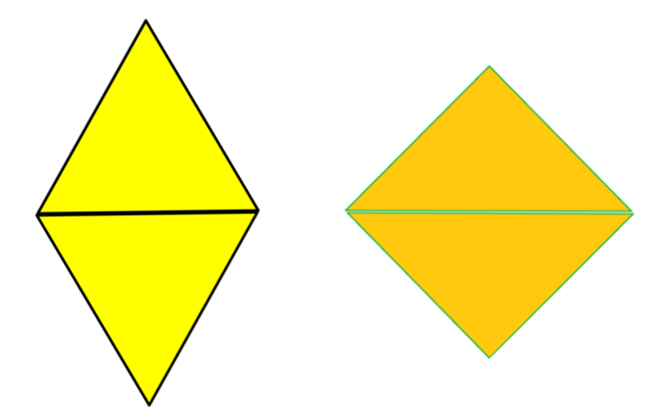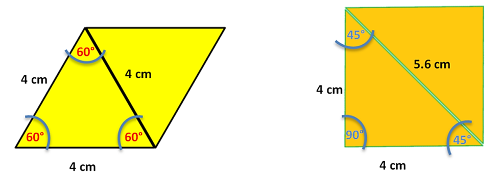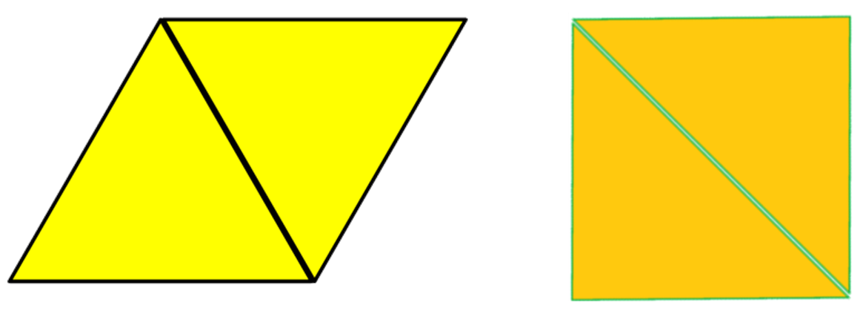 Se tienen un rombo y un cuadrado, ambos cuadriláteros están formados por dos triángulos unidos por uno de sus lados.