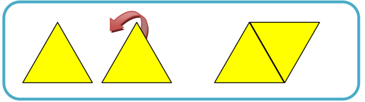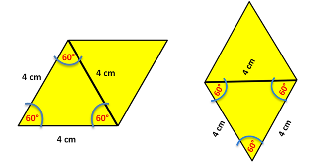 Se formó un rombo al unirlos por uno de sus lados, girando uno de los triángulos, ya que los cuatro lados son iguales por ser los lados de un triángulo equilátero y ángulos opuestos iguales ya que miden cada uno 60° y 120° respectivamente, lo que da una suma de 360° entre los cuatro.
