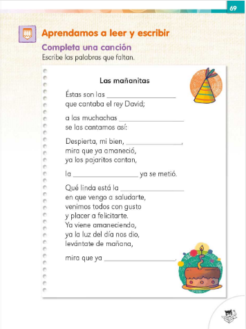 Además de eso, te invito a que realices este mismo ejercicio en tu libro Lengua Materna Español 1er grado. Pág. 69, ya sabes un seis y un nueve y completa la canción que Marisol decía que empieza igual que su nombre. Lee el título: MAÑANITAS.