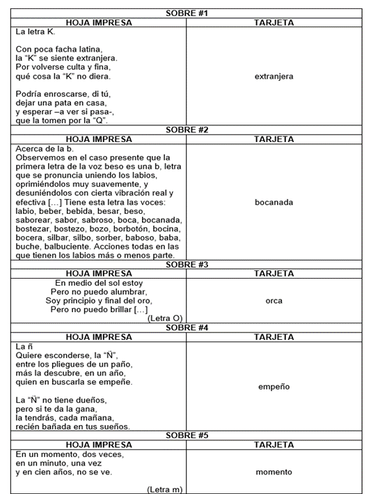 - Se colocan en el piso 5 sobres, simulando un recorrido o pista, dichos sobres estarán rotulados con el número del 1 al 5 según corresponda, cada uno contiene una hoja y una tarjeta de trabajo, la hoja tiene un texto impreso y en la tarjeta una palabra de la manera en la que se muestra en la siguiente tabla, al final del camino y de los 5 sobres, se colocará un letrero con la palabra “meta”.