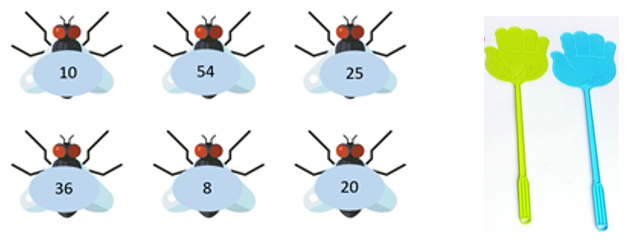 Este juego está formado por moscas que tienen en su cuerpo un número (puedes poner los números que sean necesarios para dar el resultado a las multiplicaciones) y un matamoscas por jugador.
