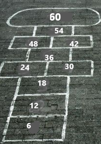 Lanza tu teja al primer cuadro y dices qué número multiplicado por 6 da como resultado 6 y saltas los demás cuadros diciendo la multiplicación en voz alta, cuando llegas al 60, saltas dando media vuelta y regresas de la misma manera, hasta el cuadro donde recogerás tu teja.